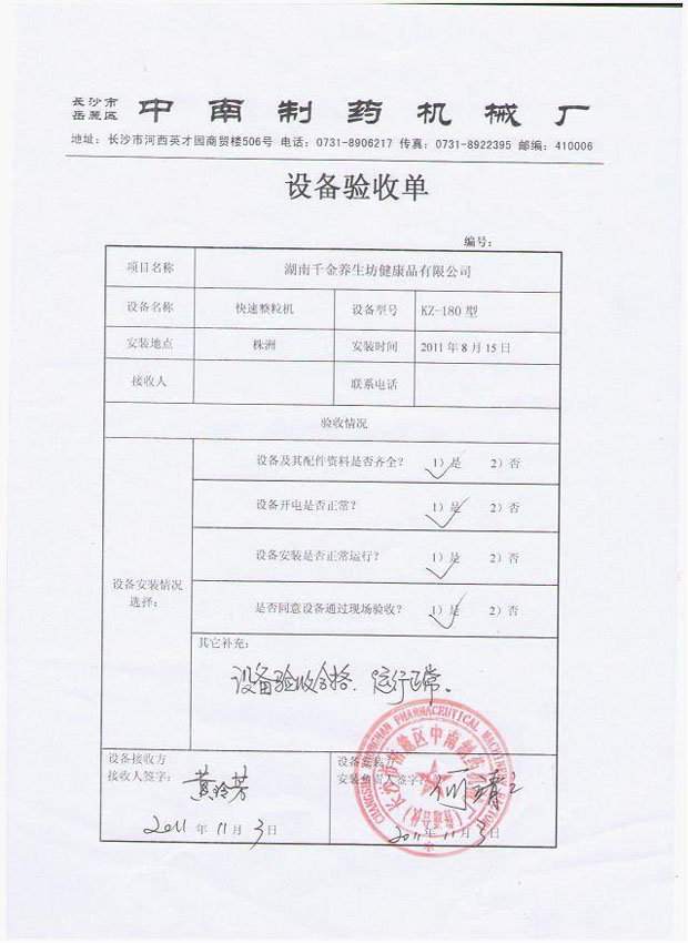 2011年10月,千金養生坊健康品有限公司向我廠購買了KZ-180型快速整粒機、ZKB-K型顆粒包裝機、DZ-60型全自動制丸機、LM型煉蜜機、RXH-48盤熱循環烘箱、CH-200型混合機、YK-160型重型顆粒機、GF-30B型帶除塵渦輪自冷式粉碎機組等設備,F已投入使用。
