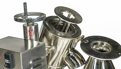 加工的原料進(jìn)入粉碎整粒機(jī)的進(jìn)料口后,落入錐形工作室,由旋轉(zhuǎn)回轉(zhuǎn)刀對原料起旋流作用,并以離心力將顆粒甩向篩網(wǎng)面,同時(shí)同于回轉(zhuǎn)刀的高速旋轉(zhuǎn)與篩網(wǎng)面產(chǎn)生剪切作用,顆粒在旋轉(zhuǎn)刀與篩網(wǎng)間被粉碎成小顆粒并經(jīng)篩網(wǎng)排出。粉碎的顆粒大小,由篩網(wǎng)的數(shù)目、回轉(zhuǎn)刀與篩網(wǎng)之間的間距以及回轉(zhuǎn)轉(zhuǎn)速的快慢來調(diào)節(jié)。