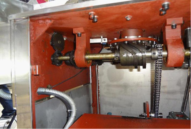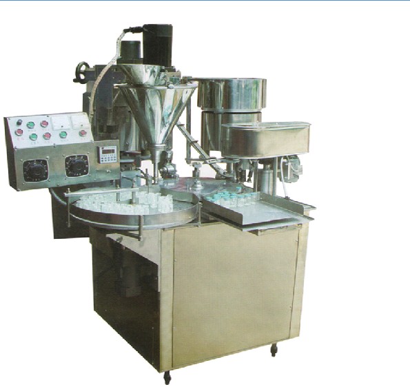 本機具有轉盤自動進瓶,自動裝粉,自動加皮塞、上鋁蓋、封口一步完成的功能。粉劑灌裝采用的微機數控調節,裝量由步進電機實現高精度計量控制,螺桿推進輸粉,裝量可任意調節。本機具有無瓶停止灌裝,傳動平穩,成品率高等優點。