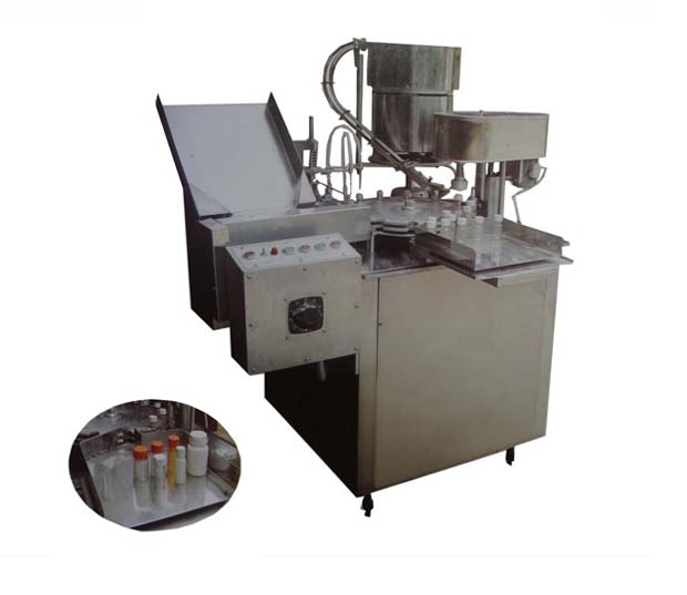本機具有自動送瓶、自動灌裝、自動上蓋、旋(軋)蓋功能。采用活塞玻璃泵計量灌裝,具有無瓶不灌控制機構。