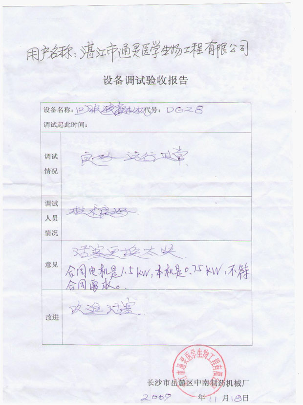 2009年11月,廣東湛江通靈生物醫學工程有限公司向我單位購買DGZ8口服液灌軋機一臺、RXH48盤熱循環烘箱一臺、GF-30B渦輪自冷式粉碎機一臺、VH-100型V型混合機一臺,經調試之后全部檢驗合格,符合GMP標準。