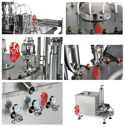本機(jī)組為10ml-20ml口服液液體灌裝生產(chǎn)線中的主要設(shè)備,能自動完成口服液瓶的洗瓶、烘干、灌裝和封口等動作。