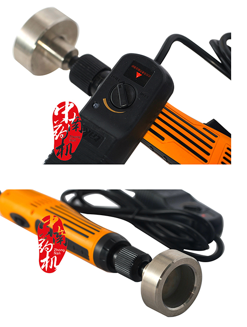 我廠成功解決了這一難題。手持式電動旋蓋槍由旋蓋槍體、旋蓋頭、多檔變壓器三部分組成。工作時,旋蓋頭罩在瓶蓋上方,旋蓋頭與旋蓋槍體相連,按動開關,旋蓋頭旋轉,稍向下用力,0.3-0.5秒鐘即可將瓶蓋旋緊。旋蓋的松緊可調節旋蓋槍體上的扭矩調節螺母實現。由于扭矩恒定,無論何種年齡、性別、體質的工人操作,也無論工作時間長短和情緒變化,旋蓋的松緊都是一致的,從而保證了產品質量。