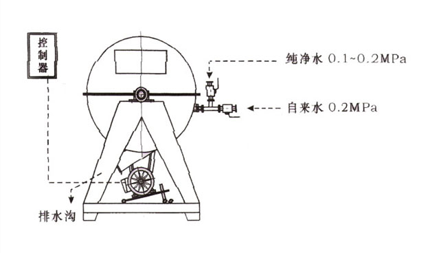 工作原理:將瓶連盤裝入該機的旋轉架上,打開進水閥門,啟動電機,變頻器將自動控制電機慢速運行進行清洗,沖洗約60秒(可調)后自動高速運行,將瓶中的水及雜質甩出,達到清洗甩干的目的。