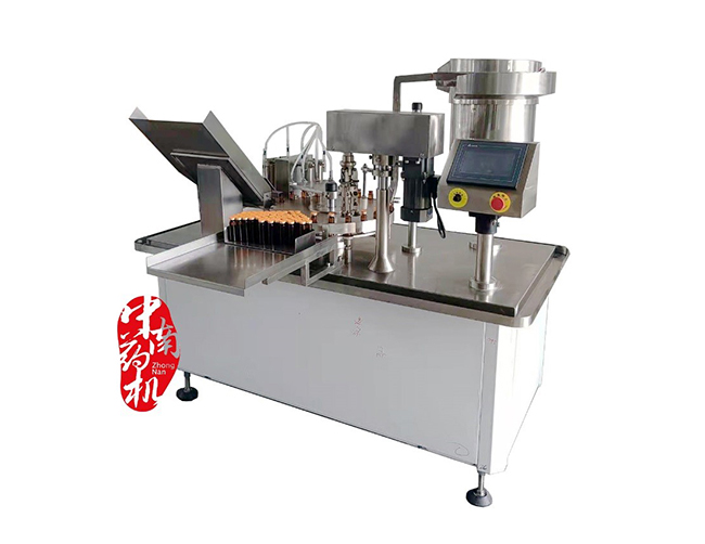 本機是口服液生產(chǎn)線中的灌裝主機,主要用于對10~20ml易拉蓋(或鋁塑蓋)直管瓶的灌裝、上蓋、封口。釆用螺桿進瓶,送瓶可靠,四頭局部跟蹤灌裝,不易產(chǎn)生泡沫;電磁振蕩送蓋,上蓋率高;三刀離心式軋蓋,軋口美觀。該機灌裝封口合二為一,結構緊湊。