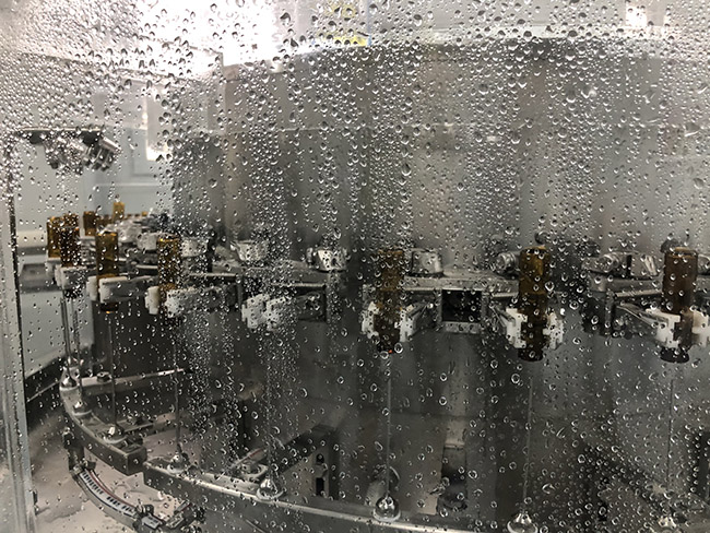 撥輪將瓶子自水中平穩(wěn)地提升并送至大轉(zhuǎn)鼓的機械手上。不銹鋼機械手將瓶子夾住并翻轉(zhuǎn)180度,使瓶口朝下,隨后依次經(jīng)過六個沖洗工位: